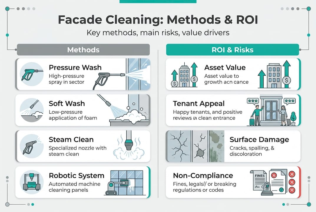 Facade cleaning is one of those line items that property managers often treat as optional, something to schedule when the budget allows or when a tenant complains. That assumption is expensive. Neglected building exteriors accumulate biological growth, pollutant deposits, and moisture-trapping grime that quietly accelerate structural deterioration, inflate repair costs, and in many jurisdictions, trigger regulatory violations. This article breaks down exactly what facade cleaning involves, which methods work for which buildings, how material risks and compliance requirements shape your decisions, and what the real financial return looks like when you treat exterior cleaning as a maintenance investment rather than a cosmetic expense.