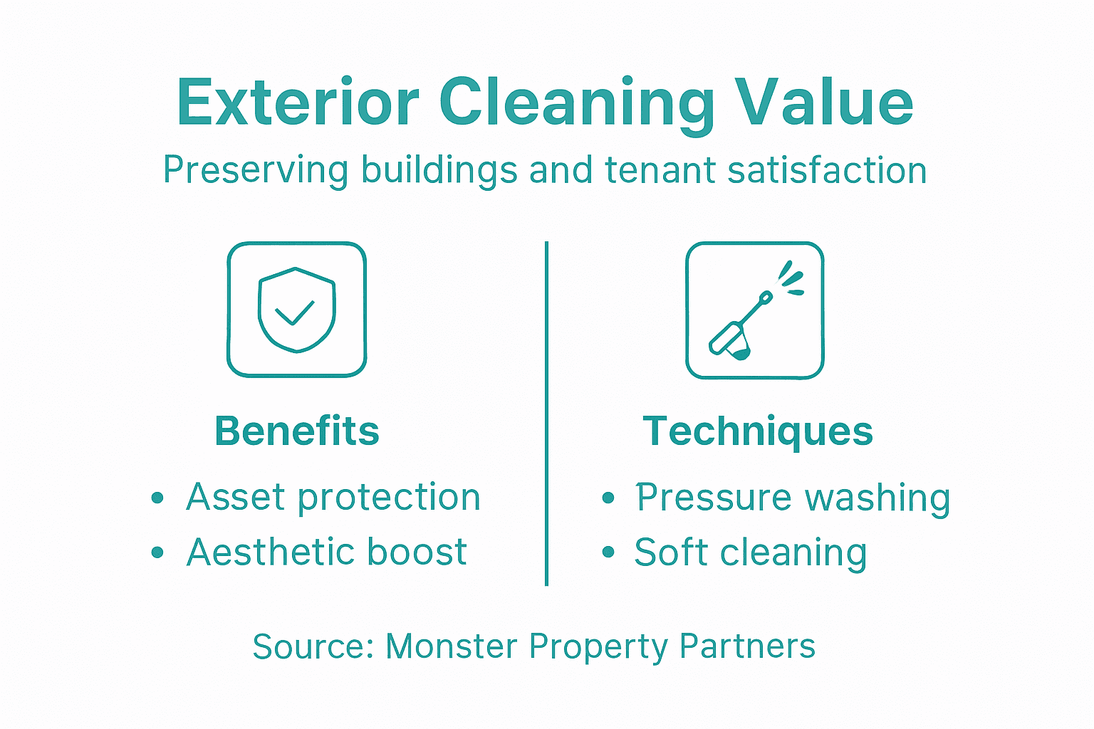 Proper exterior cleaning is an investment in property maintenance that directly impacts asset value and tenant satisfaction.