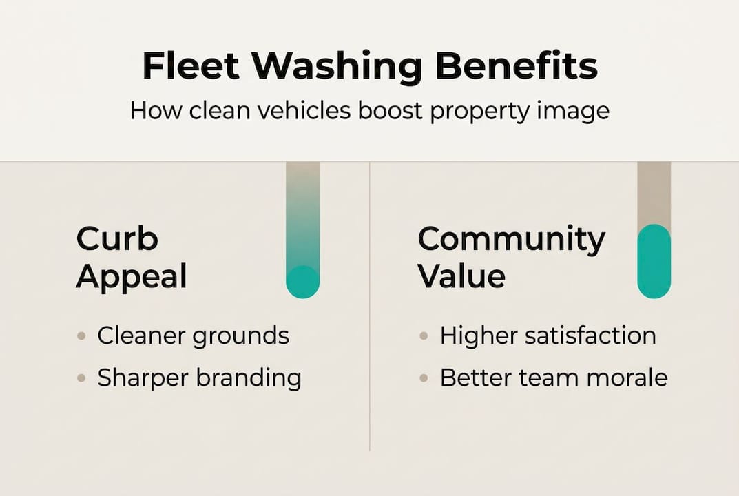 Fleet washing is also a marketing asset. Your vehicles move through the neighborhood and surrounding areas daily. Clean, branded service trucks extend your property's marketing reach without additional spend. This is one of the clearest ways to boost value and satisfaction across your community without a major budget commitment.