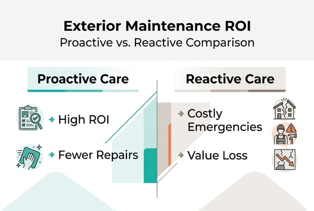 The proactive vs. reactive exterior care comparison comes down to control. Proactive owners control their costs. Reactive owners get controlled by them.