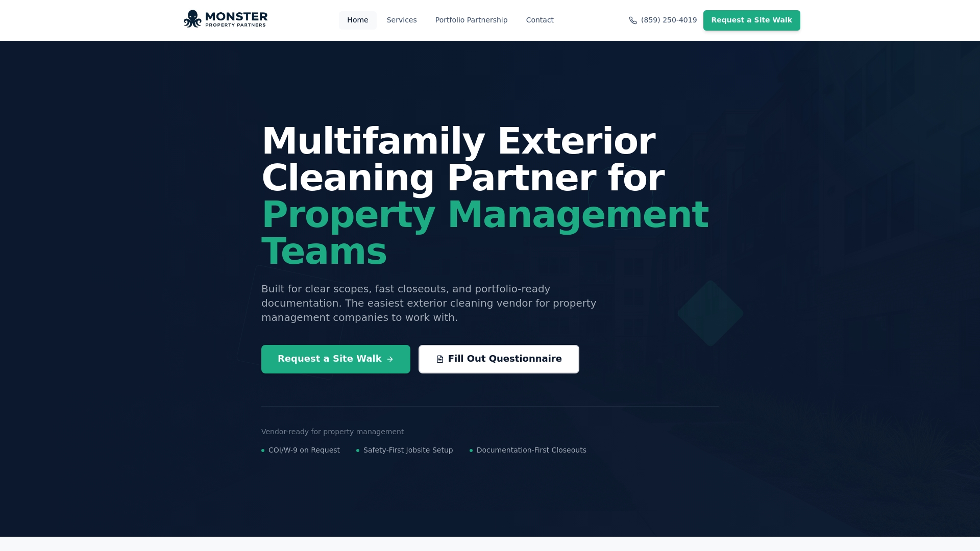 Property managers seeking reliable exterior cleaning partnerships benefit from specialized expertise in multi-family operations. Monster Property Partners delivers comprehensive pressure washing and exterior maintenance programs designed specifically for apartment buildings and multi-family communities.