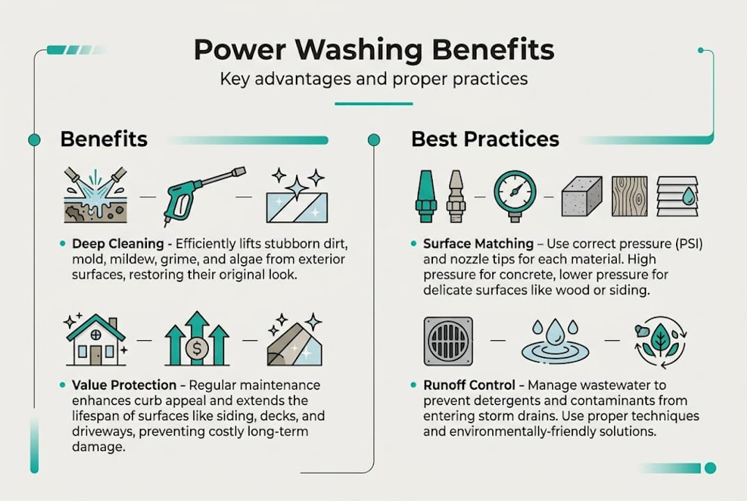 | Regulatory compliance | Proper power washing must include runoff containment to meet environmental regulations. |