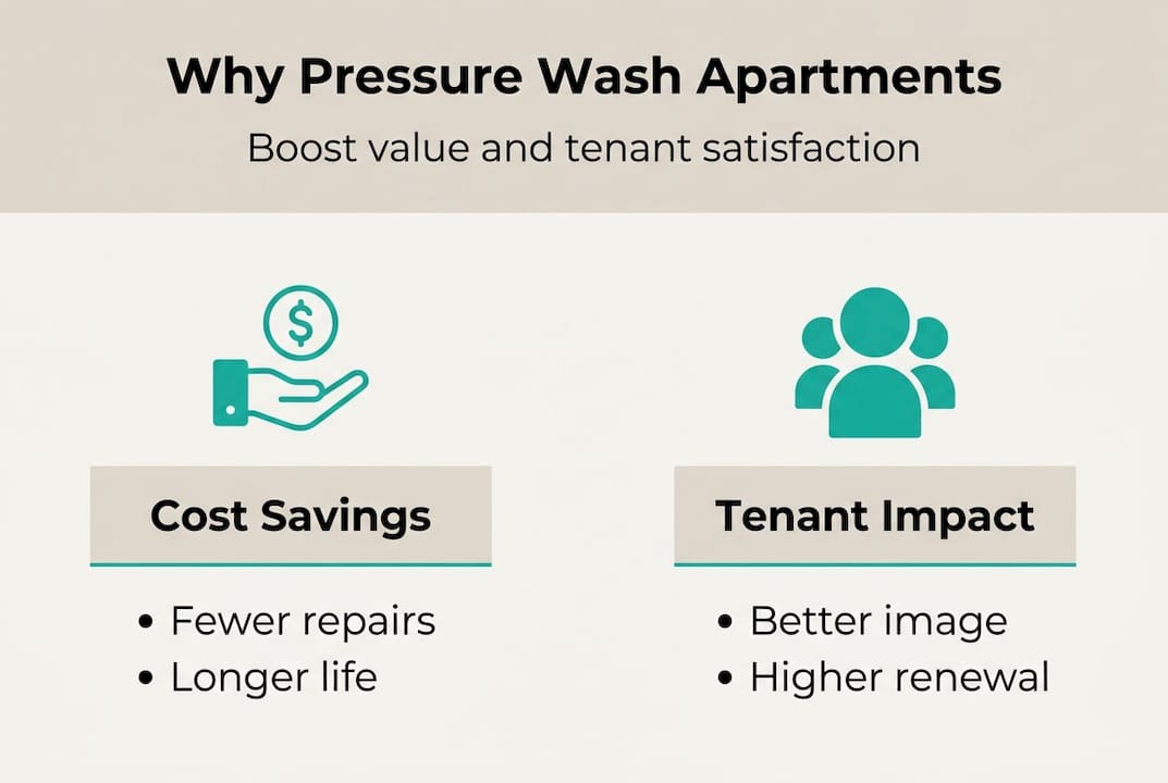 | Boosts curb appeal and value | Exterior cleanliness can raise apartment property value by 4% and helps drive positive reviews. |