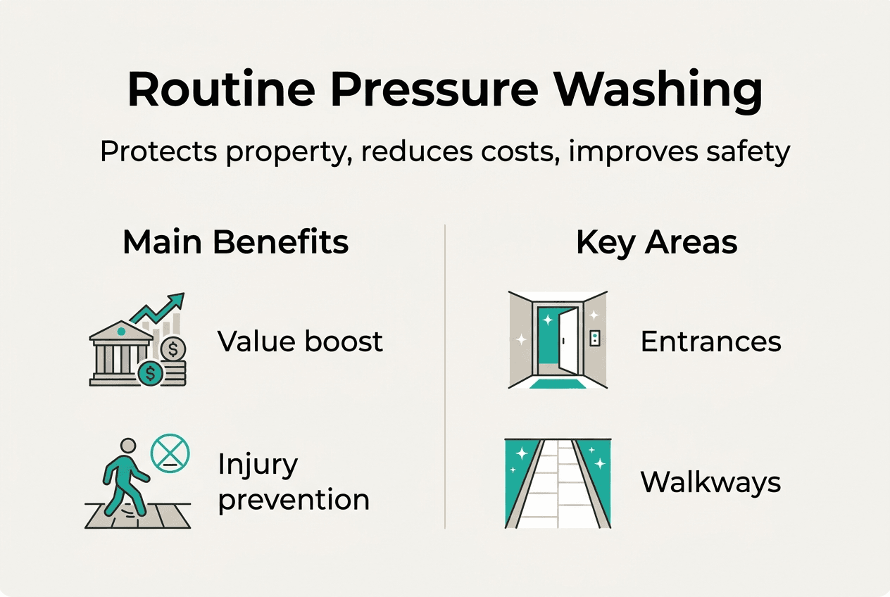 "Preventive maintenance through regular pressure washing costs significantly less than reactive repairs or liability settlements. Property managers who schedule quarterly cleanings report fewer tenant complaints and insurance claims related to exterior hazards."